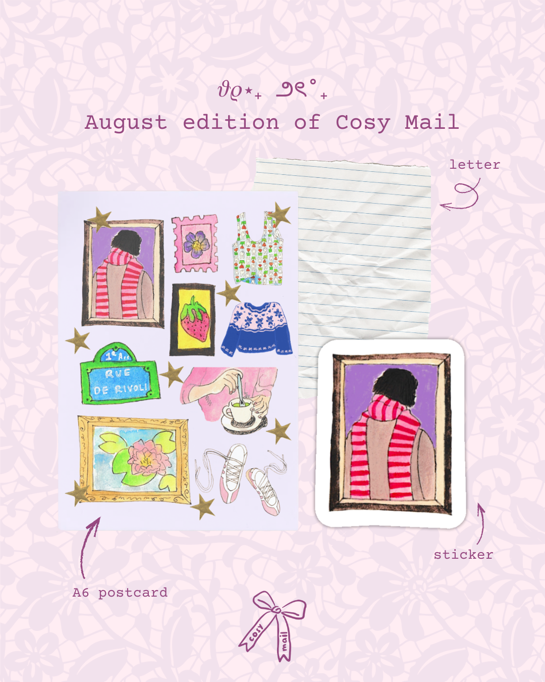 Each month, you’ll get a lovingly curated envelope with a letter, sticker, A6 postcard print, a craft prompt, and sometimes a little surprise too. My hope is that it makes you smile, sparks your creativity, and brings a touch of calm to your day!